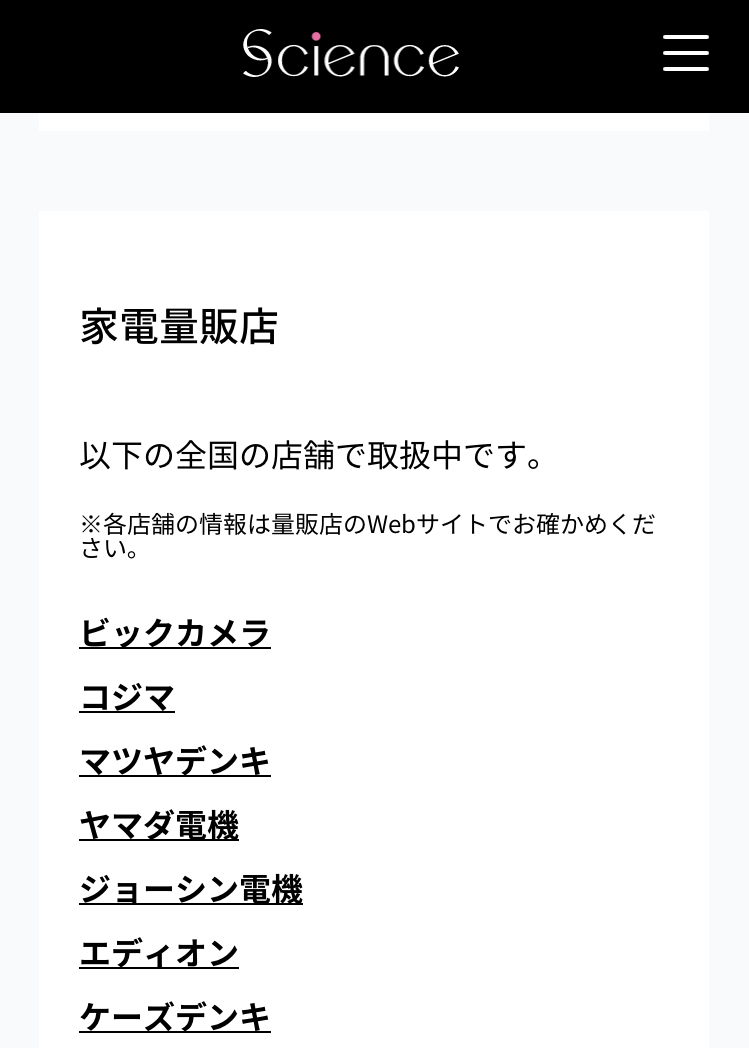 ビックカメラは、メーカーのサイエンスのホームページでも取り扱い家電量販店一覧に載っています。