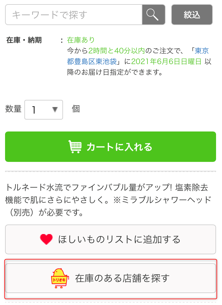 ③「カートに入れる」ボタンの更に下のほうに「在庫のある店舗を探す」のボタンがあります。