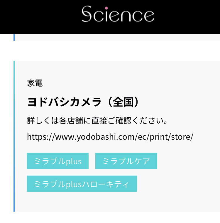 ミラブルプラスのカートリッジはヨドバシカメラでも取り扱いがあります。メーカーのサイエンスのホームページでも正規取扱店として確認できます。