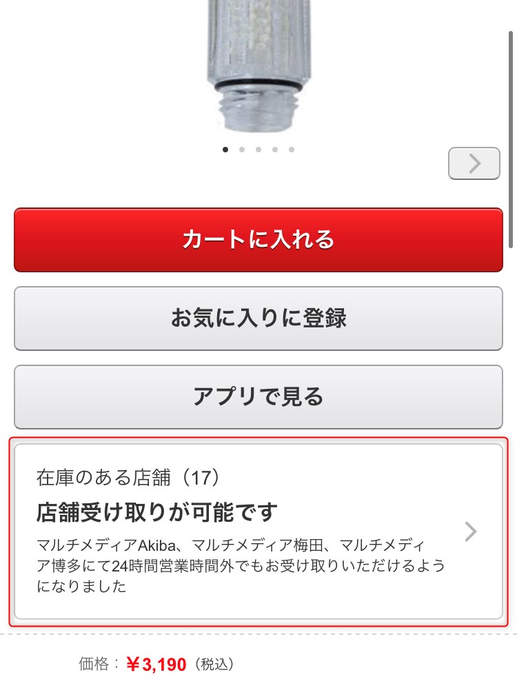 ③商品をクリックすると、画像の下のほうに「在庫のある店舗」のボタンがあるのでクリックする。